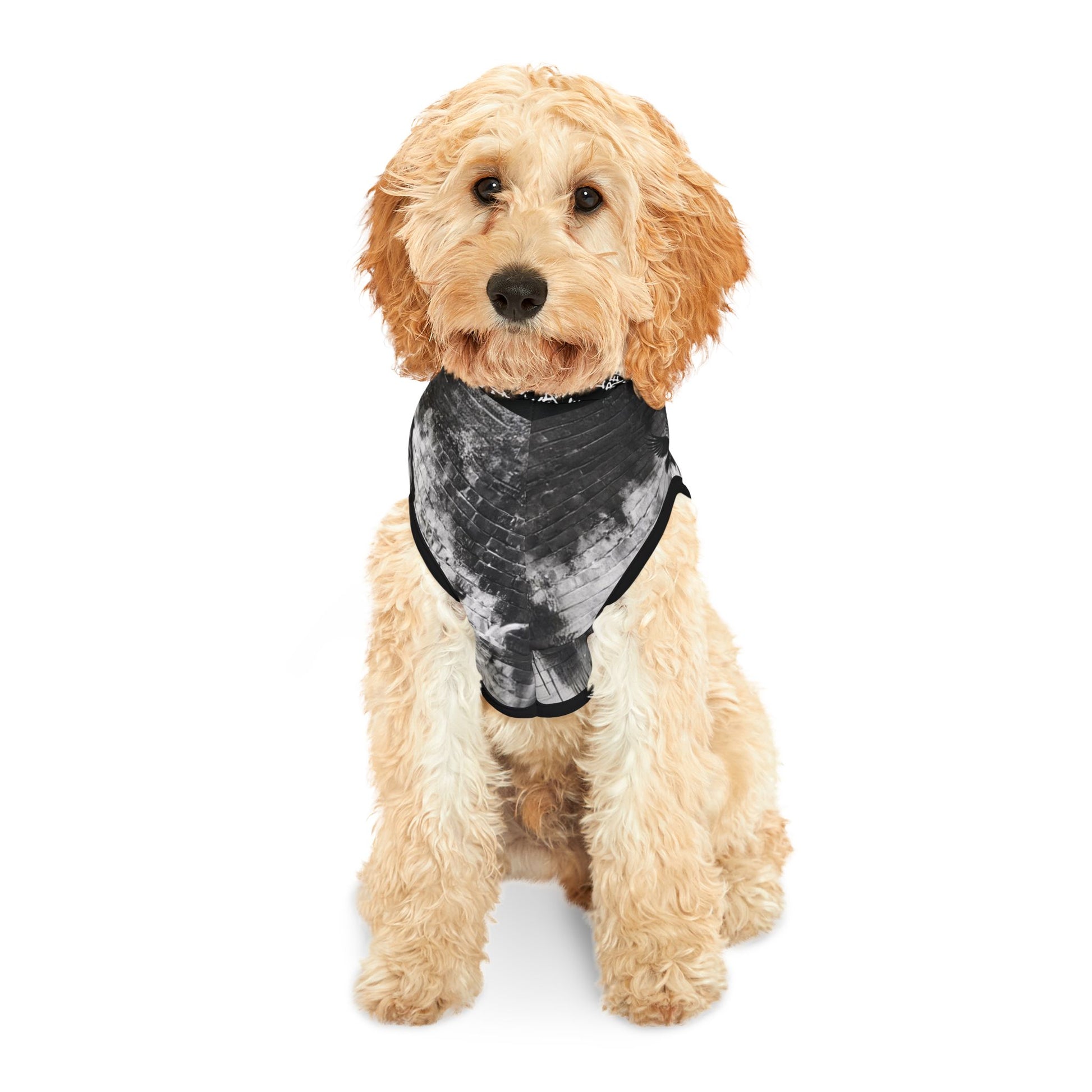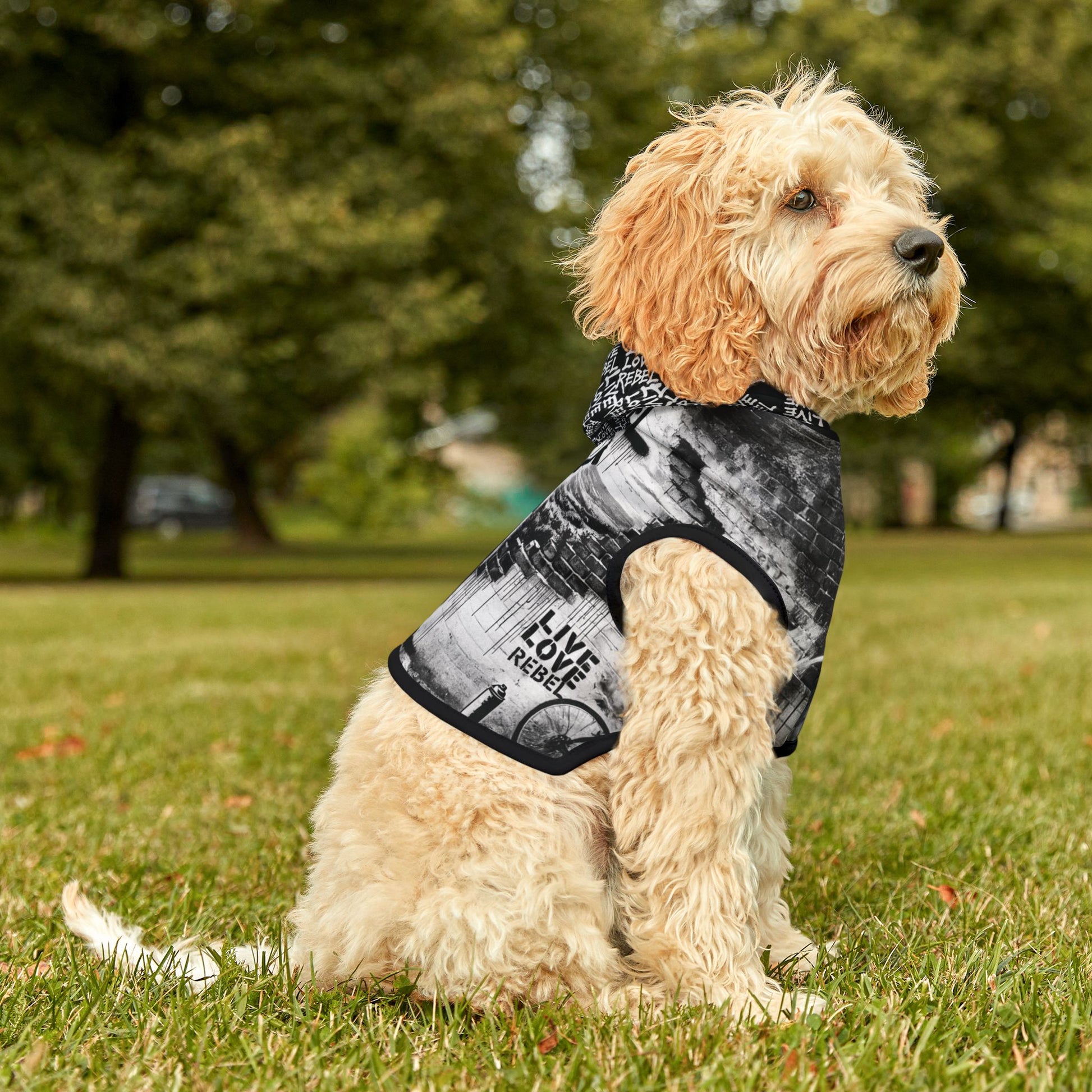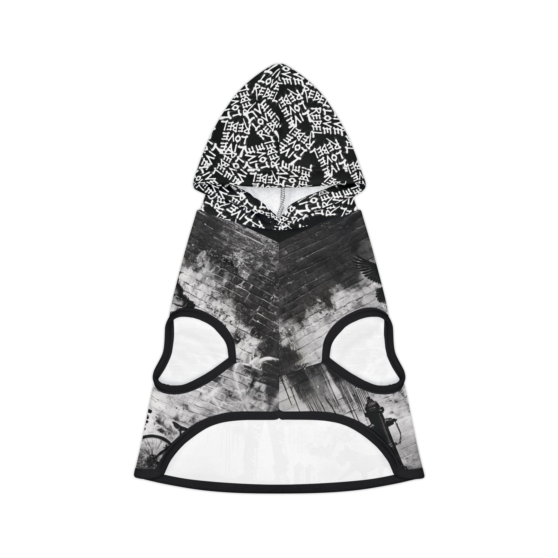 This soft, all-over print pet hoodie brings urban edge to your dog's walks. The black-and-white street-art motif—complete with stencil-style lettering and heart-shaped wings—feels like a late-night alley mural turned wearable. Lightweight polyester keeps the shape and color vivid, while the fitted hood and trimmed armholes give a snug, confident fit. It’s for pet parents who love bold, graphic style and want their pup to stand out on city streets, neighborhood strolls, or picture-ready outings.